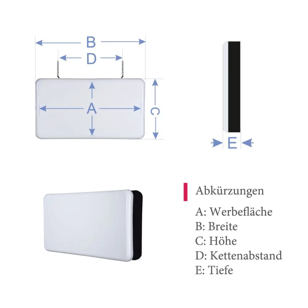 | Produktcode | Masse (mm) | Power | Gewicht | A (mm)Werbefläche | B (mm)Plexiglas | C (mm)Sockelmass (h) | D (mm)Sockelmass (b) | E (mm)Fußtiefe | F (mm)Tiefe | G (mm)Höhe | H (mm)Breite | I (mm)Kettenabstand |
